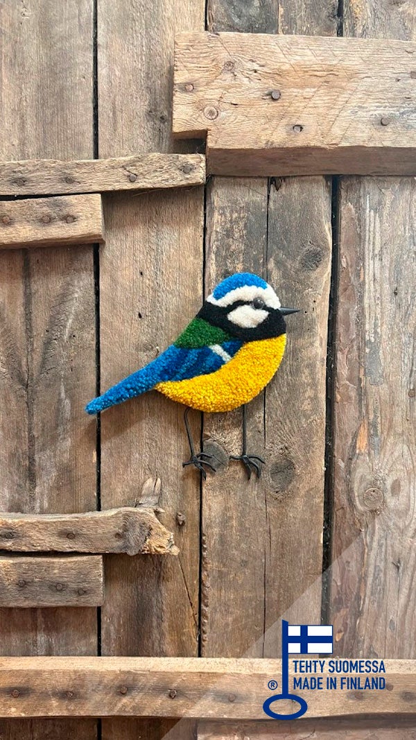 Langat 100% villaa, tausta koivuvaneria. Nokka ja jalat kierrätettyä metallia, olen hitsannut ne käytetyistä rautanauloista. Takana ripustusratkaisu, josta saa kiinnitettyä seinään. Myös muita lintuja saatavilla.