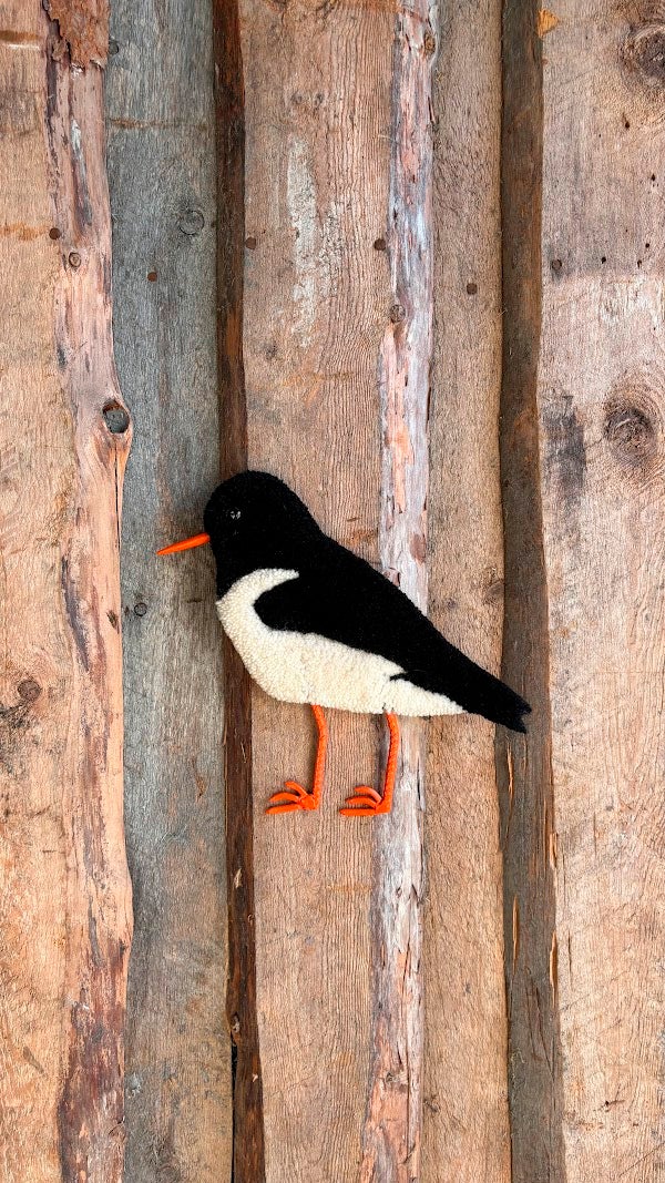 Langat 100% villaa, tausta koivuvaneria. Nokka ja jalat kierrätettyä metallia, olen hitsannut ne käytetyistä nauloista ja harjateräksestä. Takana ripustuslenkki, josta saa kiinnitettyä seinään. Sarjaan kuuluu myös muita lintuja.