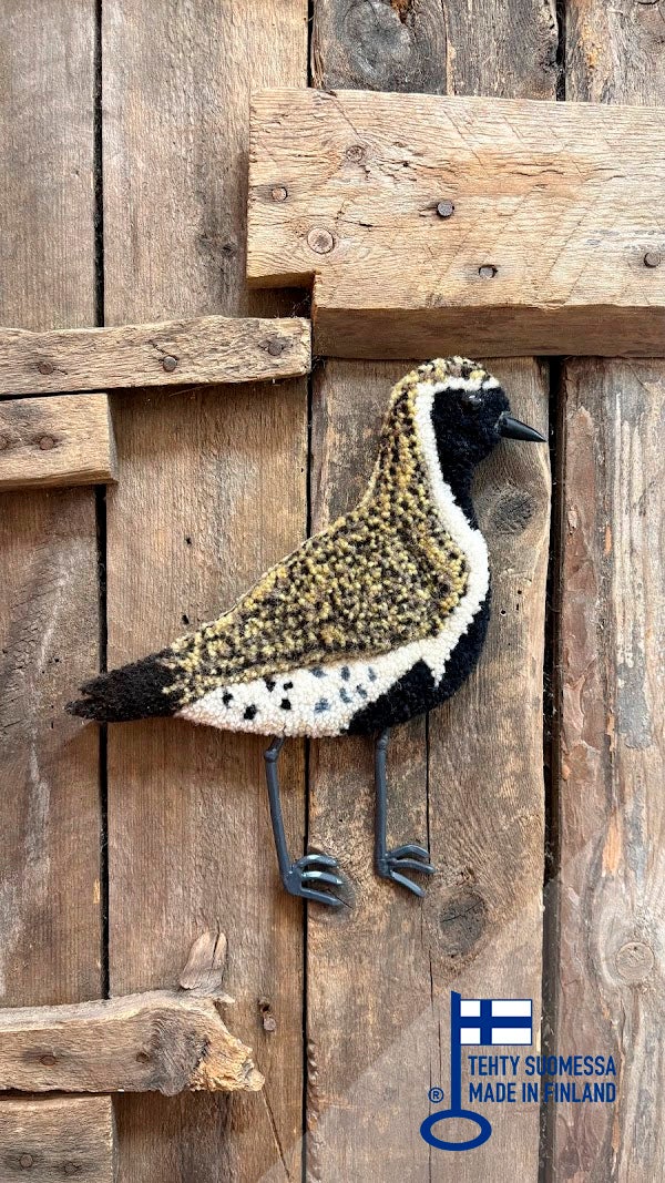 Langat 100% villaa, tausta koivuvaneria. Jalat kierrätettyä metallia, olen hitsannut ne käytetyistä rautanauloista. Takana ripustin, josta saa kiinnitettyä seinään. Myös muita lintuja saatavilla.